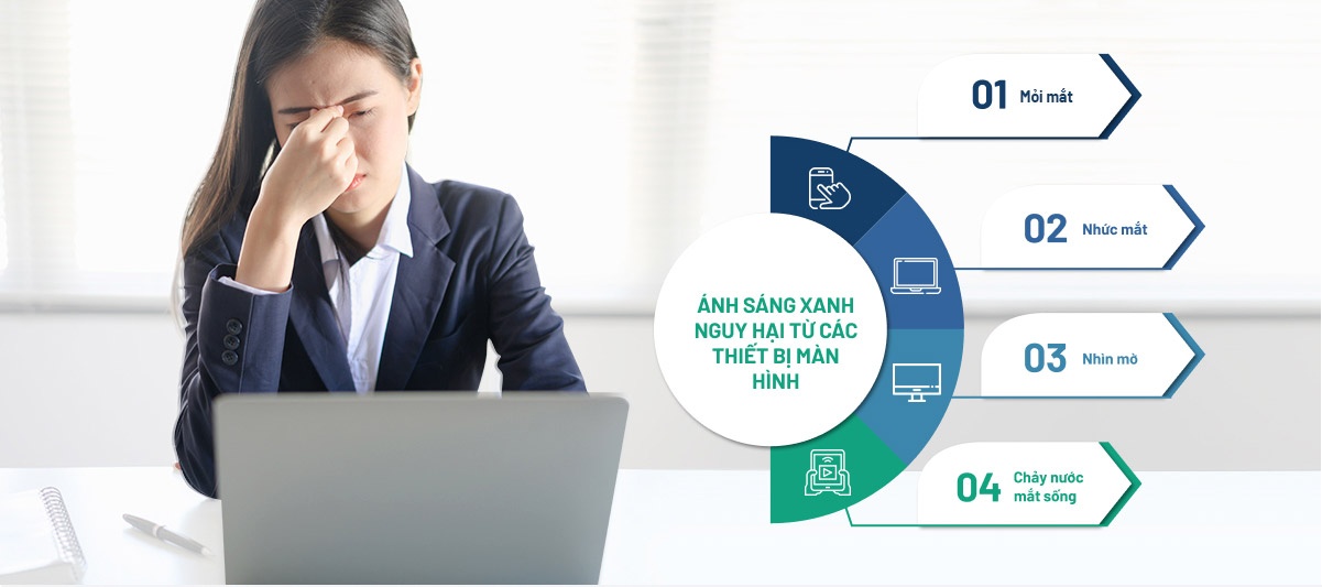 Ánh sáng xanh nguy hại, phát ra từ màn hình tivi, điện thoại, máy tính…đang tấn công, làm tổn thương, phá hủy mắt mỗi giờ, gây nhiều bệnh về mắt nguy hiểm thậm chí mù lòa. Mắt kêu cứu vì khô, đau nhức, mờ, mỏi, chảy nước mắt sống, khó tập trung học tập, làm việc và sinh hoạt.
